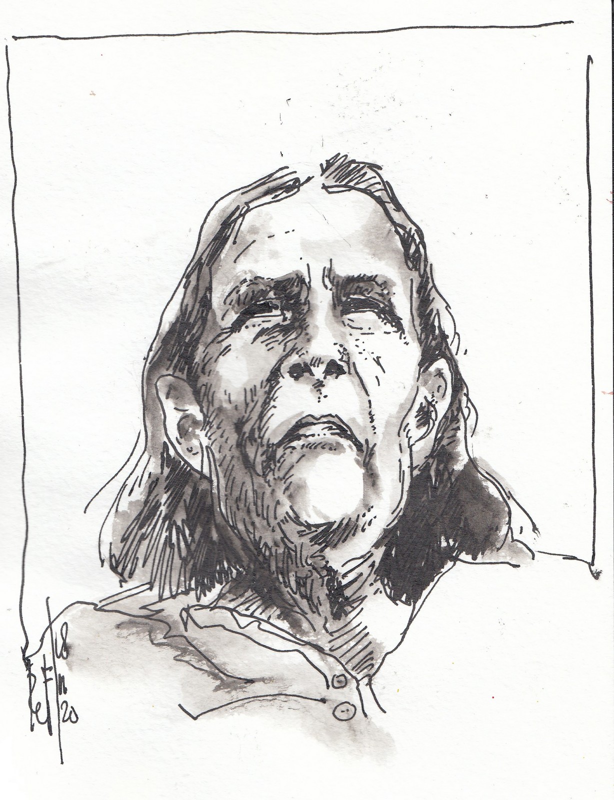 Portrait of a man, based on a picture found on the Internet, I can't recall who made it. Fountain pen, I wash the ink before it's dry with a waterbrush. I found the original photographer: Jim Zuckerman.