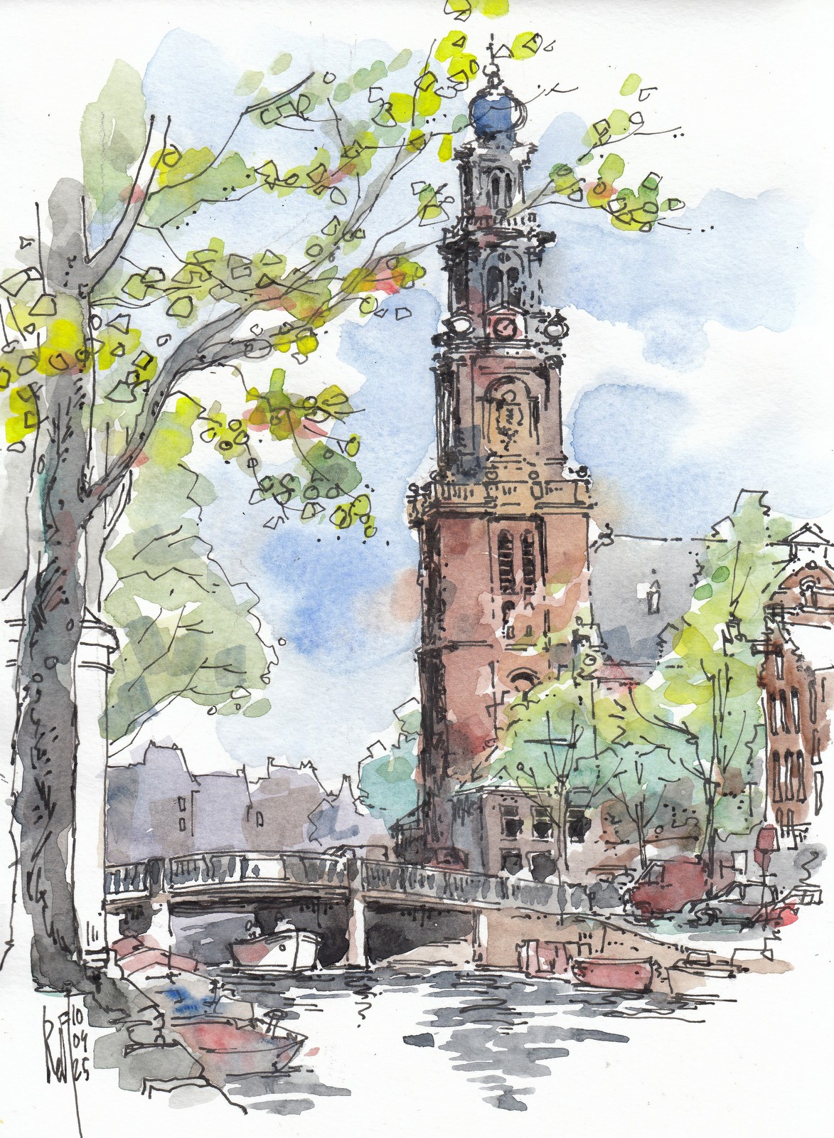 Visited Amsterdam yesterday. To the Anselm Kiefer exhibition "Sag mir wo die blumen sind" in the Van Gogh and Amsterdam Stedelijk museum. Made this sketch of the Westerkerk on a bench along the Prinsengracht.
